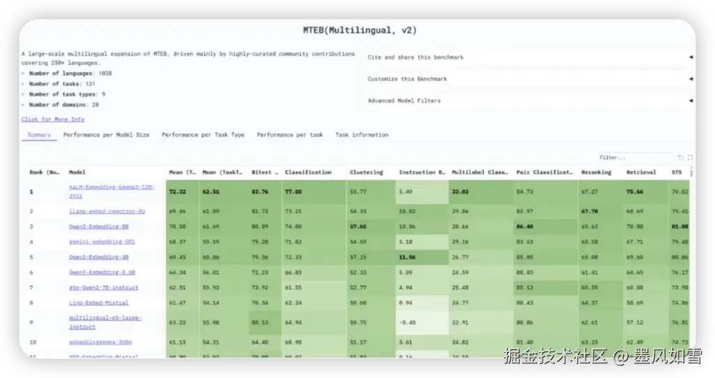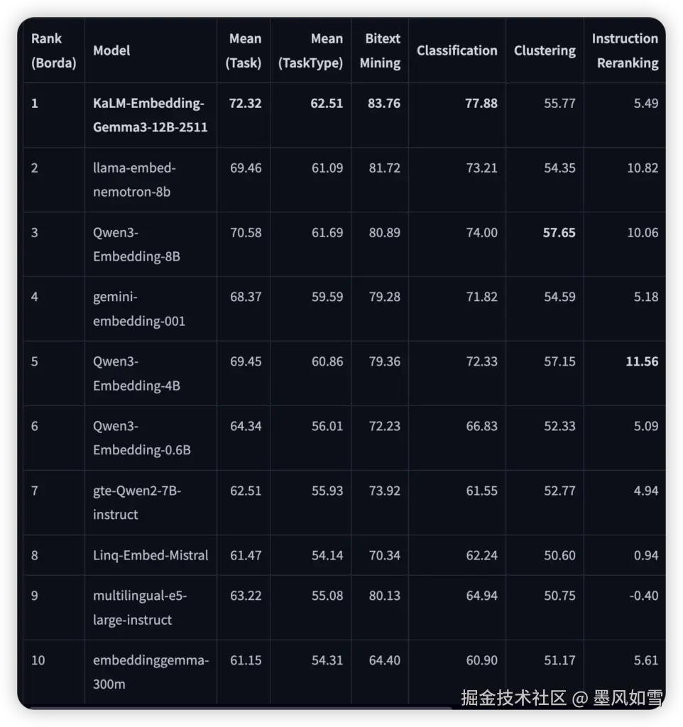 这个名为KaLM-Embedding-Gemma3-12B-2511的模型,其名字虽略显技术化,却掩盖不住其背后所蕴含的强大力量。它并非仅仅在几项任务中表现突出,而是在一个涵盖了全球1038种语言、131项复杂任务的庞大评测体系中,以平均任务得分72.32、平均任务类型得分62.51的惊人成绩,力压群雄。这其中,不仅包括了大家耳熟能详的NVIDIA Llama-Embed、阿里巴巴通义千问Qwen3-Embedding,甚至连谷歌的Gemini-Embedding-001也未能超越。想象一下,一个模型能够如此精准地理解和对齐全球近千种语言的语义,这无疑是一场语言智能的盛宴,为全球范围内的信息交互和知识传递打开了新的可能。