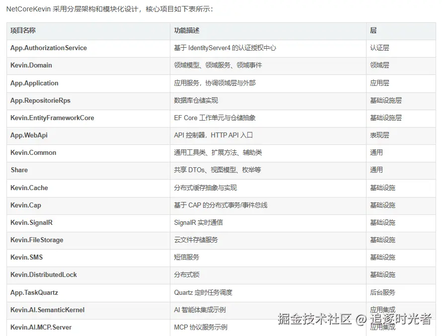 NetCoreKevin 是一个基于 .NET 8 + DDD 搭建的模块化微服务框架,其模块化设计使得每个功能都可以独立引用,非常适合大型企业级应用的开发。框架支持IdentityServer4单点登录、多缓存、自动任务、分布式、一库多租户、日志、授权和鉴权、CAP集成事件、SignalR、领域事件、ESL、MCP协议服务、IOC模块化注入、Cors、Quartz自动任务、多短信集成、AI智能体、AI 集成 SemanticKernel、MCP 服务、OCR验证码识别、API多版本兼容、单元集成测试。