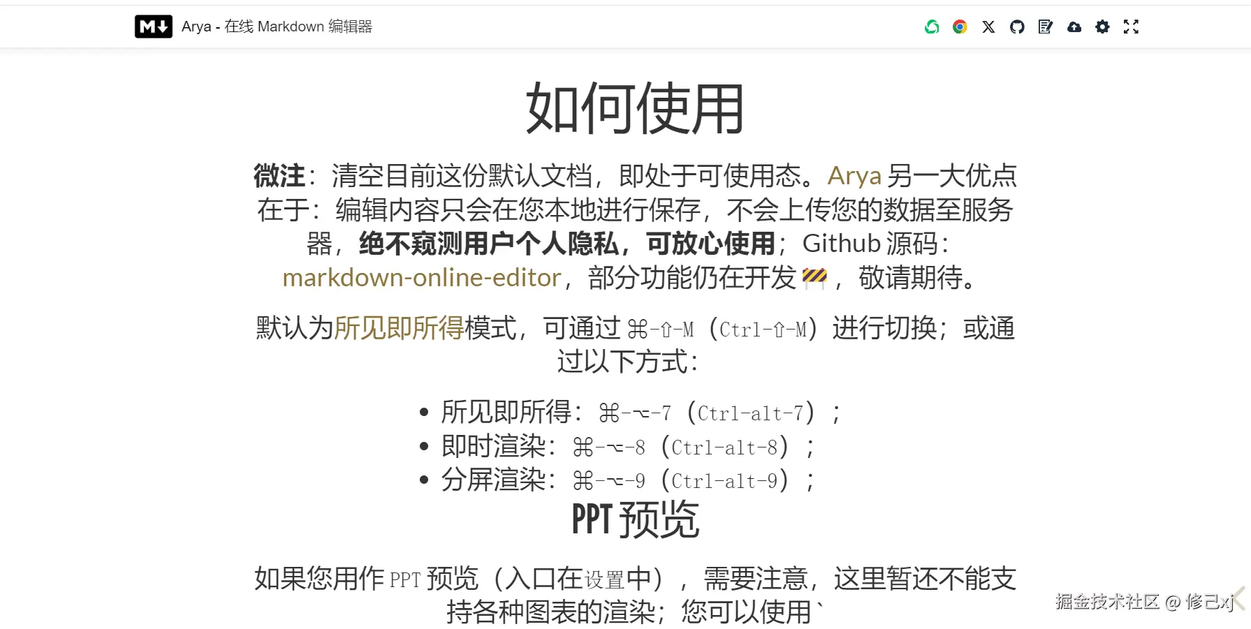 Arya 是一款基于 Vue2 和 Vditor 构建的现代化在线 Markdown 编辑器。它不仅具备了传统 Markdown 编辑器的所有基础功能,还集成了众多高级特性,让 Markdown 写作变得更加高效和愉悦。 该项目在github上已有3.3k star.