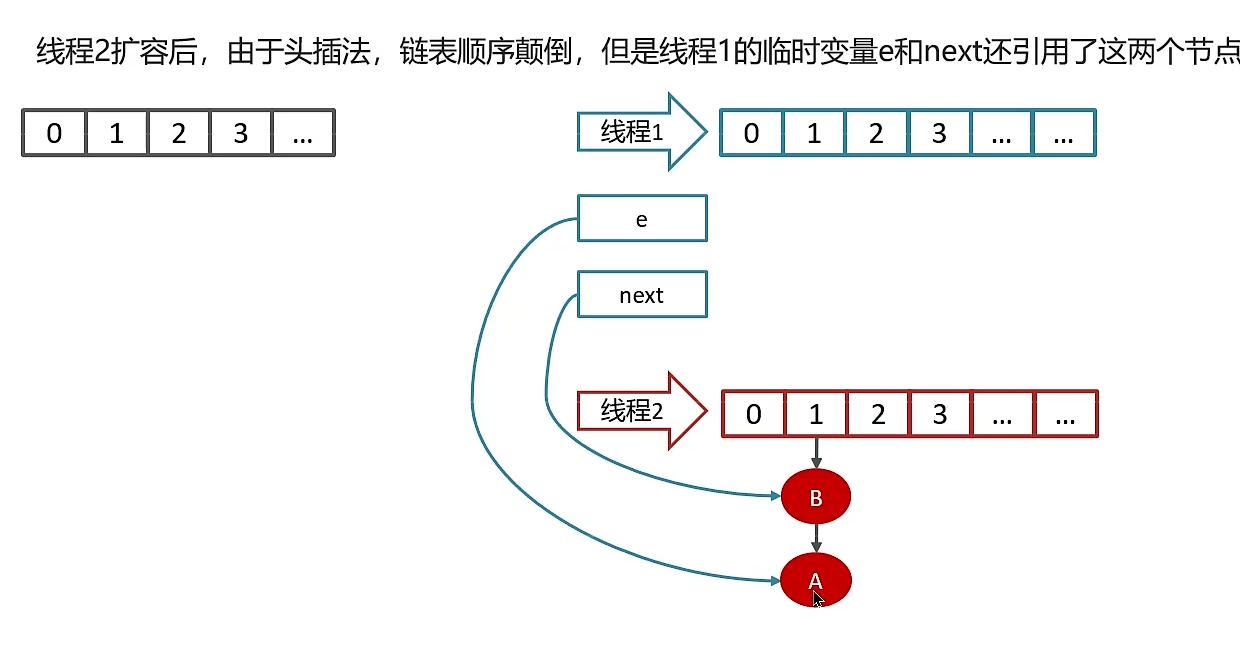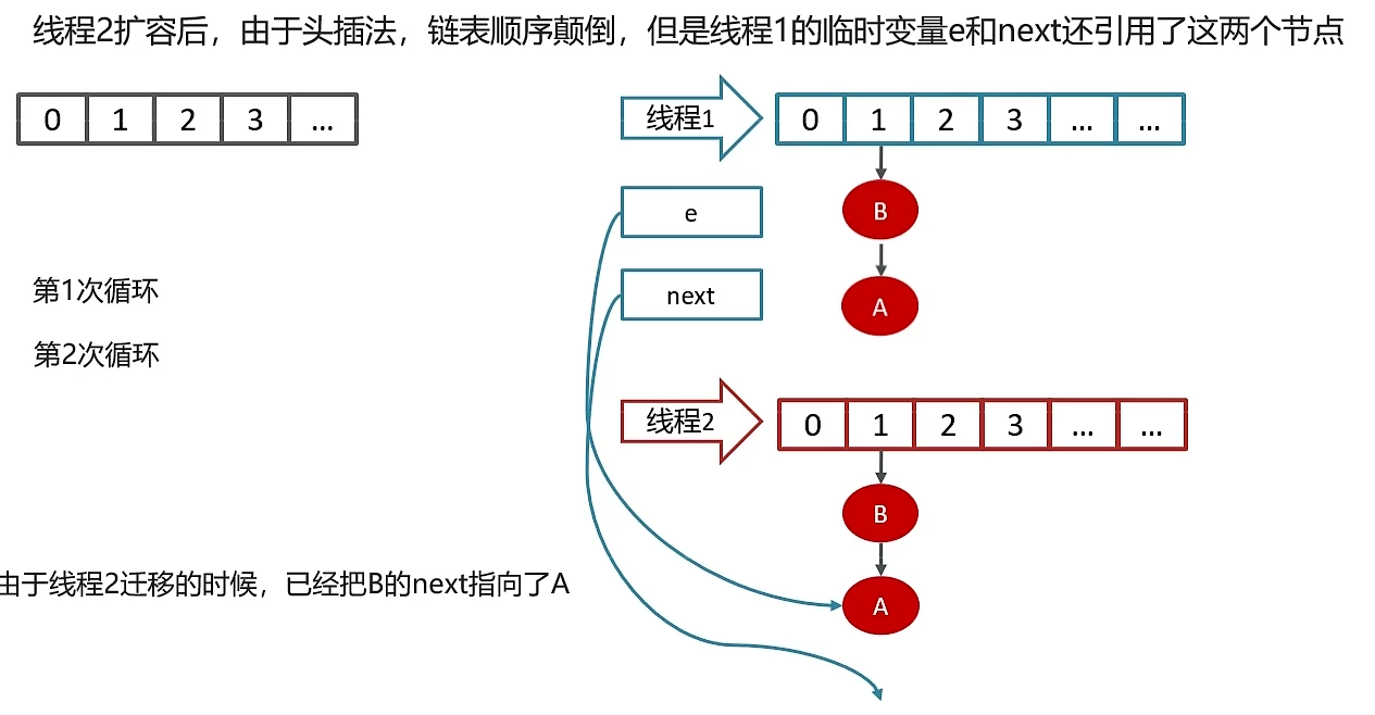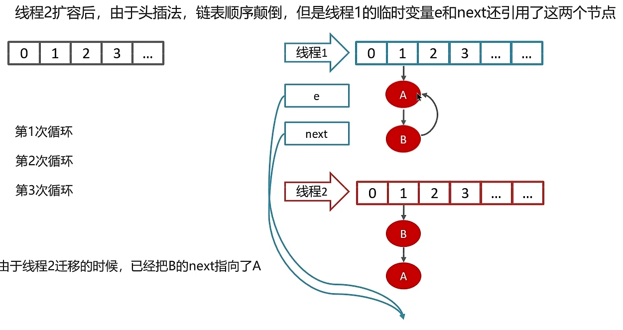 线程一继续执行,再次使用头插法,将链表改为A->B,由于刚才线程二的原因,B的next指向了A,链表就会变成 A->B->A的情况,后期其他线程访问该map时,就会出现链表的死循环。