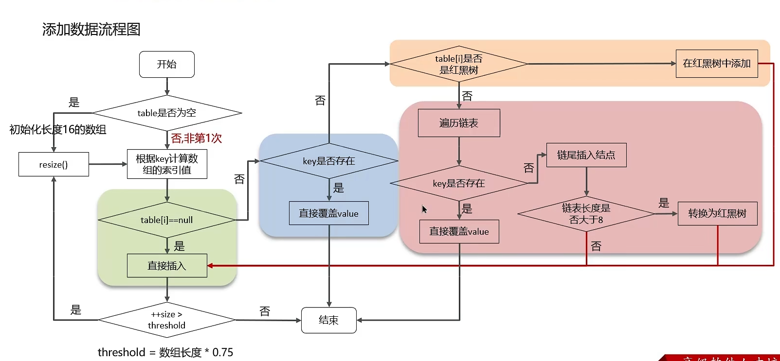 2.2 jdk1.8在解决哈希冲突时有了大变化,当链表长度大于阈值(默认8)时并且数据长度打到64时,则链表会转化为红黑树,以减少搜索数据的时间。扩容resize()时,红黑树拆分成的树节点数小于等于临界值6时,则退化为链表。
