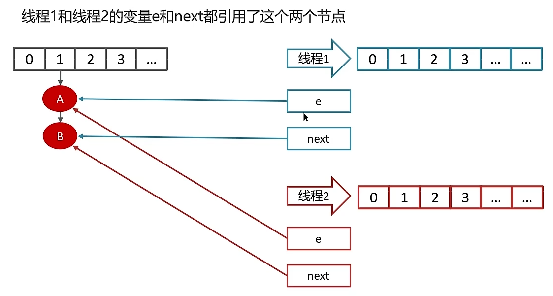 线程一 : 读取到当前hashMap的数据,数据中有一个链表,在准备扩容时,线程二接入;