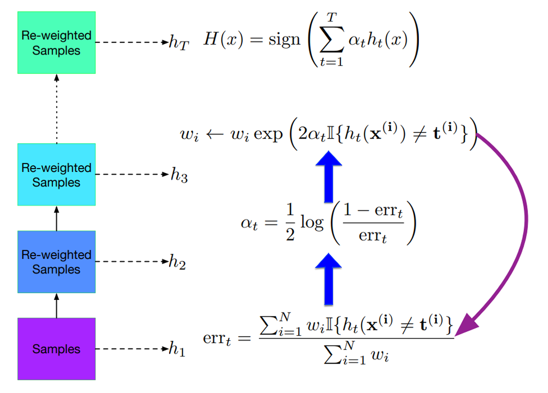 h m ← arg min h ∈ H ∑ i = 1 N w i ( m ) exp ( 2 α t I { h t ( x ( n ) ) ≠ t ( n ) ) h_m \leftarrow \arg\min_{h \in \mathcal{H}} \sum_{i=1}^{N} w_i^{(m)} \exp \left( 2\alpha_t \mathbb{I}\{h_t(\mathbf{x}^{(n)}) \neq t^{(n)} \right) hm←argminh∈H∑i=1Nwi(m)exp(2αtI{ht(x(n))=t(n))