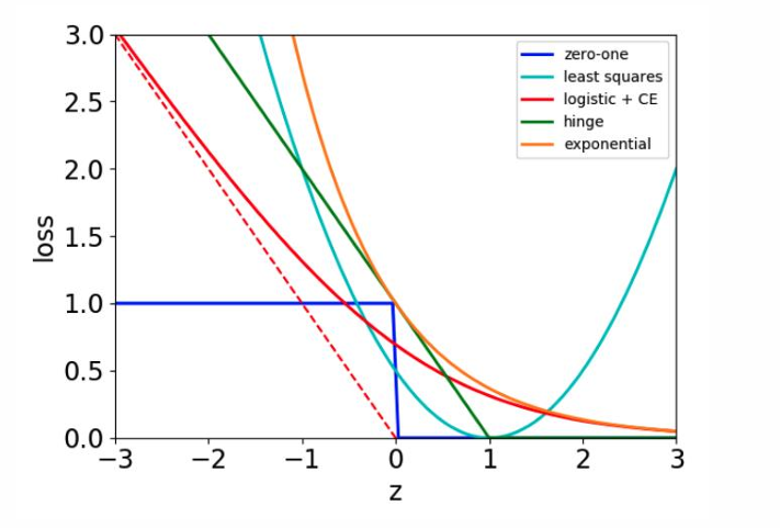 下图展示了不同损失函数随预测值 z z z的变化曲线: