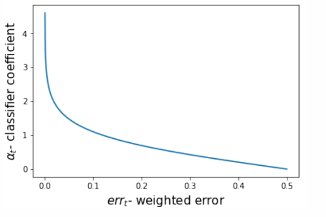 α = 1 2 log ( 1 − err m err m ) \alpha = \frac{1}{2} \log \left( \frac{1 - \text{err}_m}{\text{err}_m} \right) α=21log(errm1−errm)