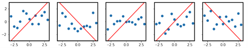 每次从真实分布采样一个数据集,用线性回归拟合出一条 w x wx wx,斜率 w w w会随数据波动而在 [ − 1 , 1 ] [-1, 1] [−1,1]内变化。