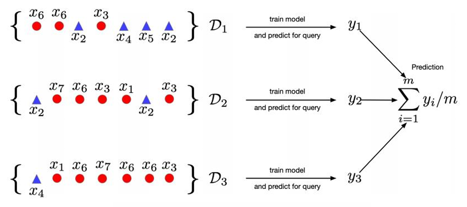 我们用这 3 组训练集分别训练了 3 个模型,我们把同一条查询样本 x 喂给每个模型 , 得到 3 个预测值,取平均(回归)或投票(分类)作为最终输出。