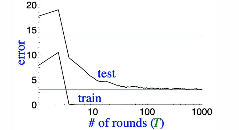 随着我们添加更多的弱分类器,整体分类器 H H H变得更加"复杂"。我们预计更复杂的分类器会过拟合。