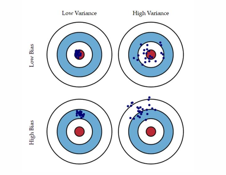 下图用飞镖的比喻来形象地解释了偏差(Bias)和方差(Variance)对模型预测性能的影响。
