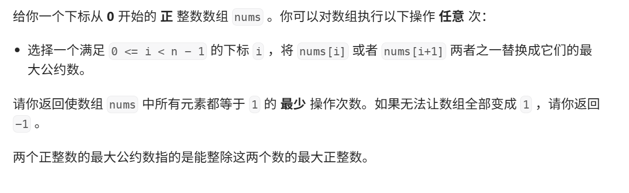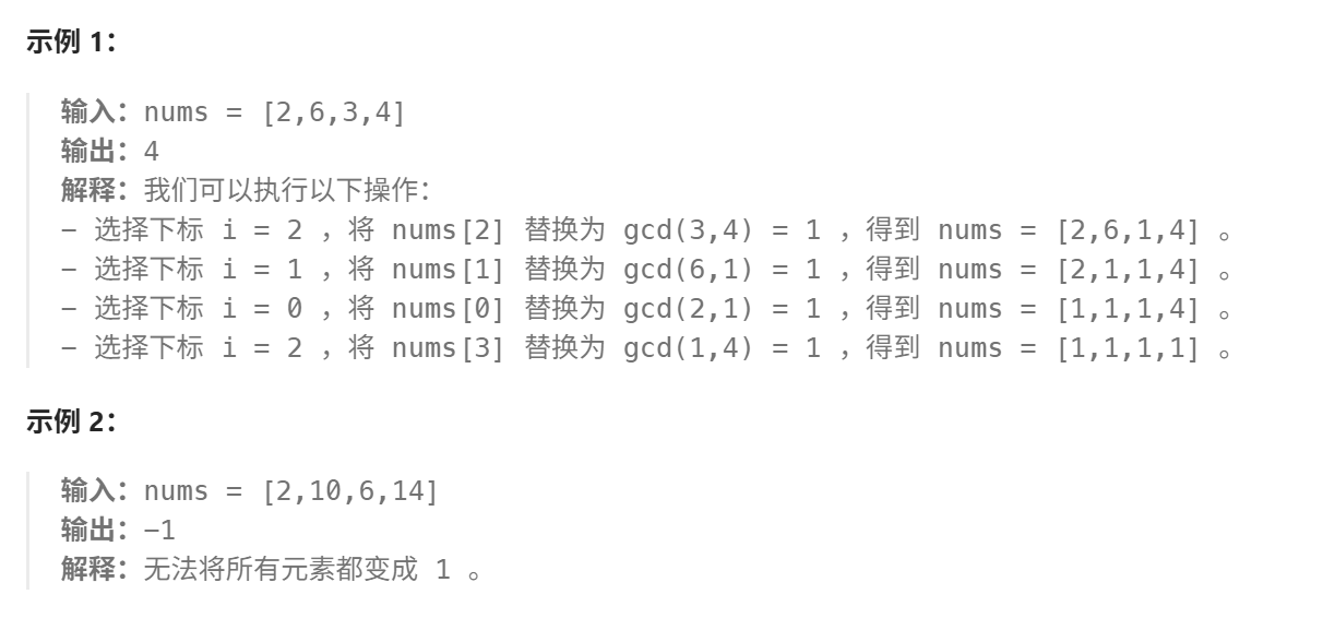(3)若数组中不存在1 ,但是存在最大公约数为1的子数组 ,那么就可以利用这个子数组,将这个"后天"的1进行扩散,操作次数为length-1+nums.size()-1,即length+nums.size()-2,length为最大公约数为1的数组的元素的个数。