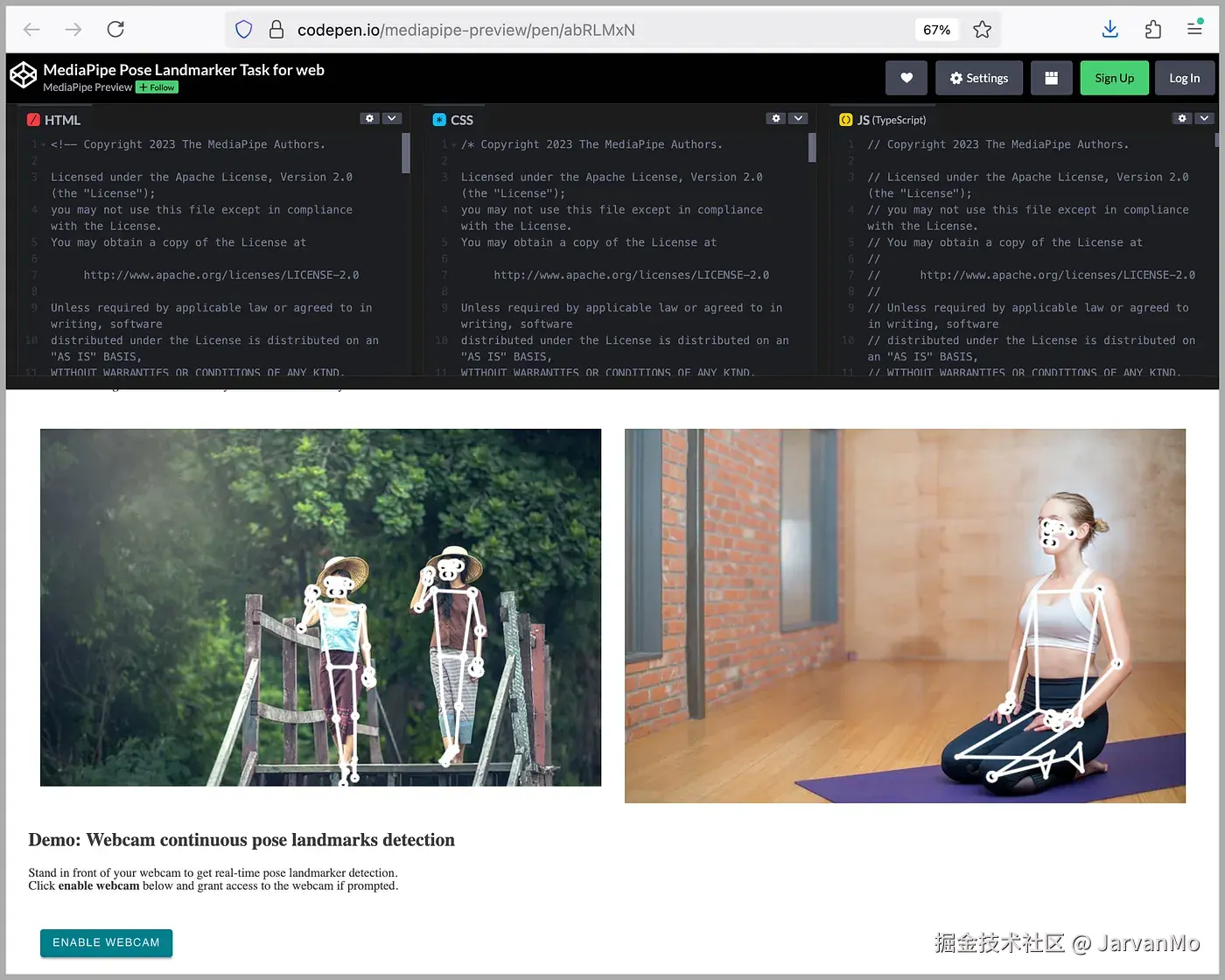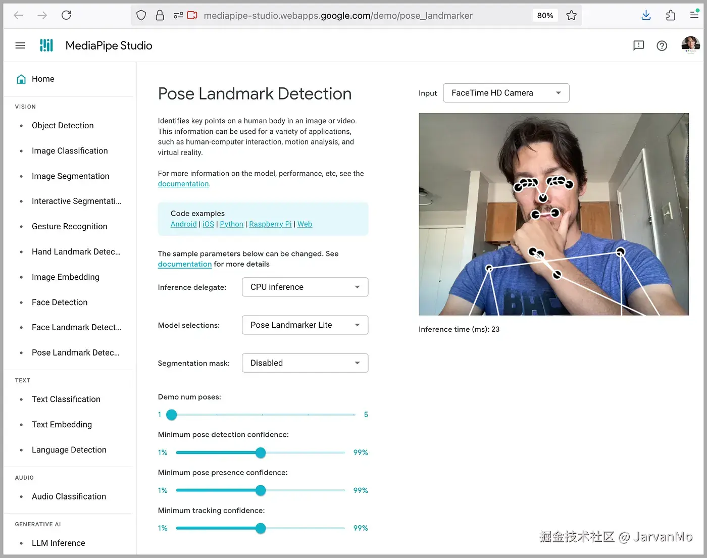 它还有一个 CodePen 代码片段 ,方便你用 JavaScript 快速进行实践操作(或"上手"): codepen.io/mediapipe-p...