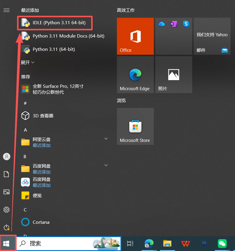 安装好后,在开始菜单中找到IDLE(python 3.11 64-bit),