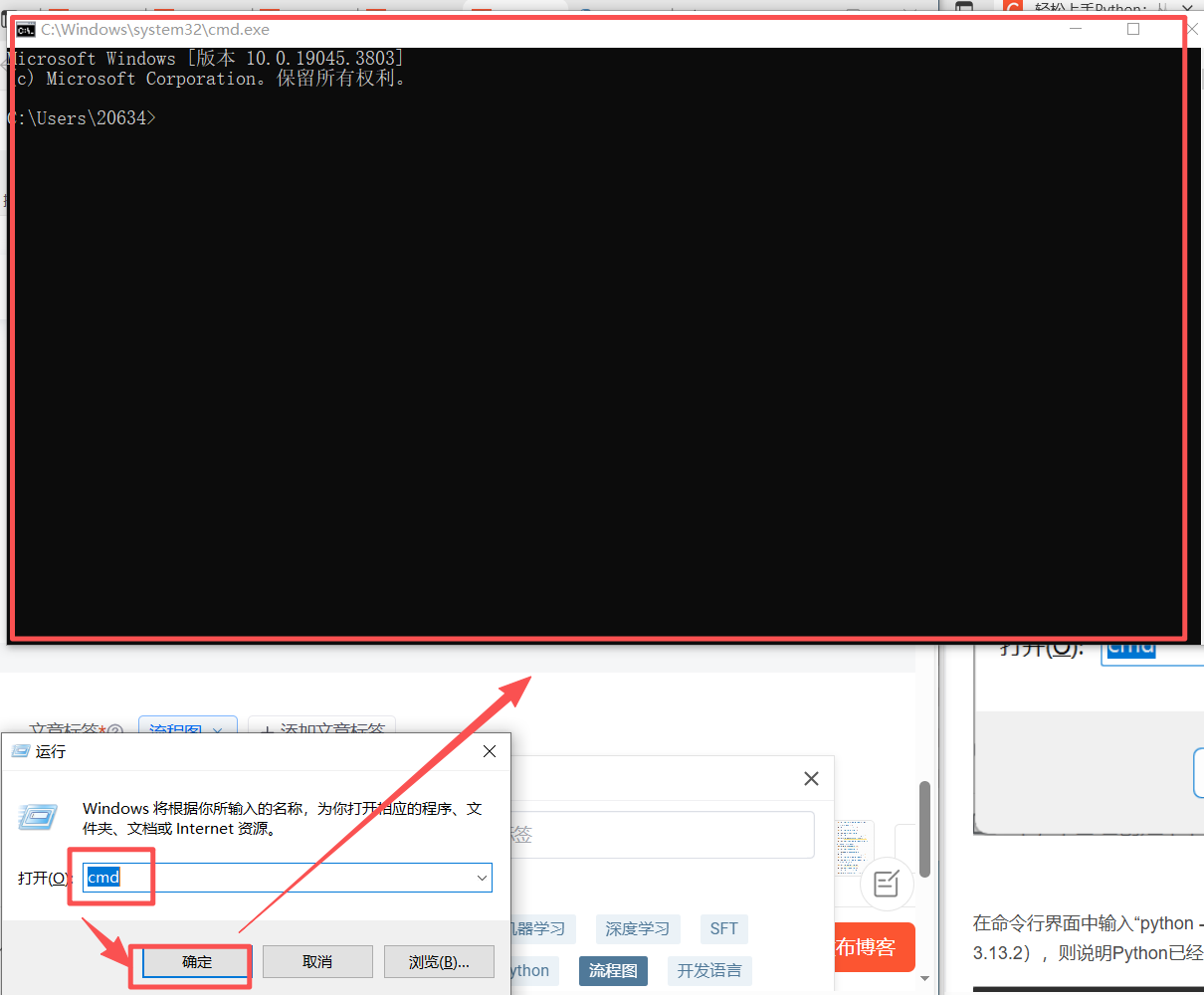 2、在运行窗口中输入"cmd",打开命令行界面。
