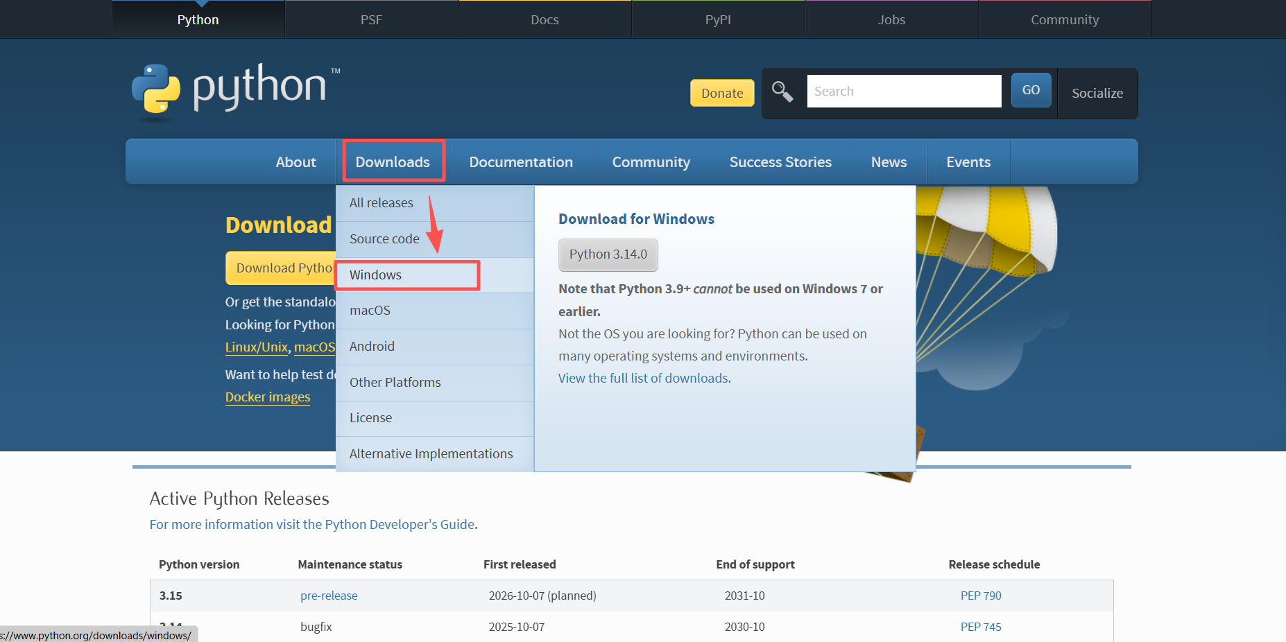 1、打开浏览器,访问Python官方网站:https://www.python.org/,点击上方 downloads