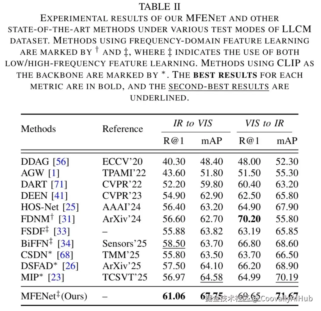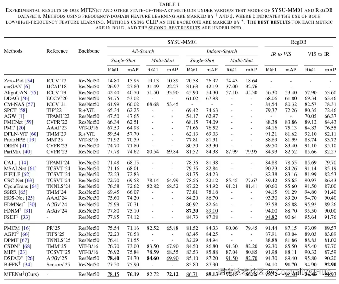 MFENet在三大主流VI-ReID基准数据集(SYSU-MM01、RegDB、LLCM)上进行了全面评估,结果令人印象深刻: