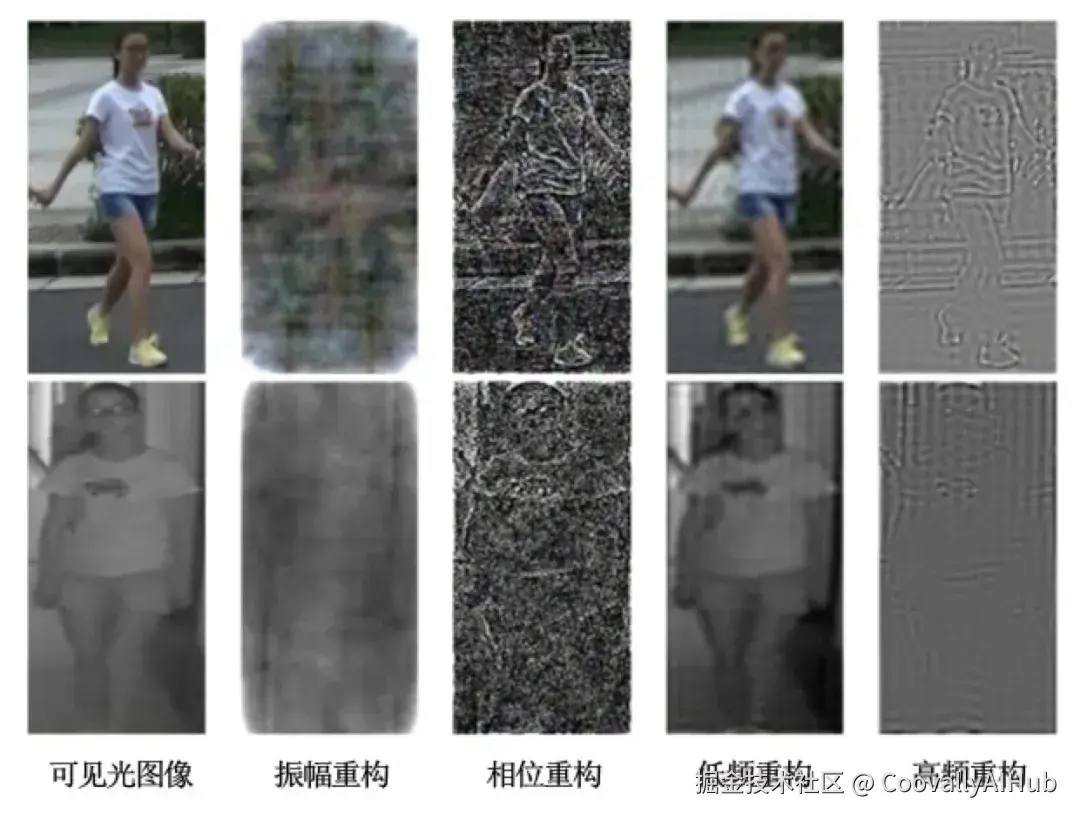 简单来说:空间域(我们正常看到的图像)回答"这里有什么",频域(经过傅里叶变换后)回答 "图像由哪些基础模式组成" 。在频域中,图像信息可以分为:低频信号:代表图像的整体轮廓、色块和缓慢变化的背景。在VI-ReID中,这部分充满了"模态噪声"(如颜色信息vs温度信息);高频信号:代表图像的边缘、纹理和突变细节。这部分藏着"身份黄金"(如人的轮廓、携带物品的形状,这些在两种模态间是共享的)。