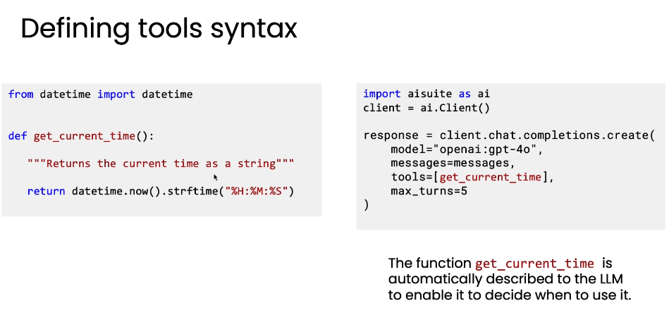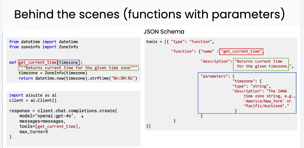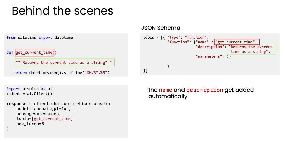 AI Suite 自动化封装: 在调用 client.chat.completions.create 时,AI Suite 自动读取函数信息,生成标准的 JSON Schema。
