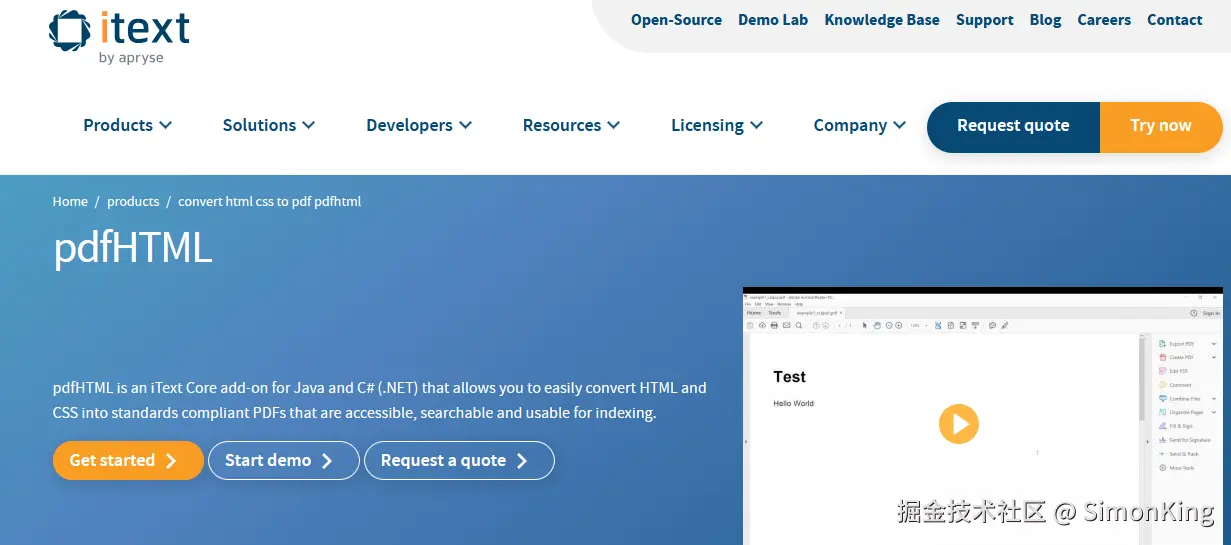 iText pdfHTML是iText7套件的一个附加组件,专门用于将HTML和CSS内容转换为PDF文档。它基于iText核心PDF生成引擎,提供了高质量的HTML到PDF转换功能。性能表现非常优异。