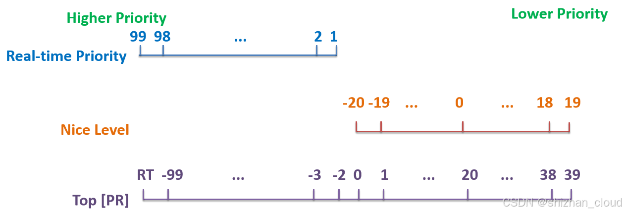 实时调度器进程优先级和非实时调度器进程优先级对比如下: