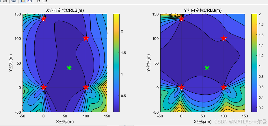 进一步,计算并可视化展示整个空间中 X 轴和 Y 轴方向的 C R L B CRLB CRLB分布,帮助分析不同方向上的定位精度差异。
