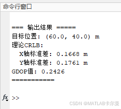 针对目标真实位置,计算其理论定位精度下限( C R L B CRLB CRLB),包括 X 轴和 Y 轴方向的标准差以及对应的 G D O P GDOP GDOP值,并以文字形式输出分析结果。
