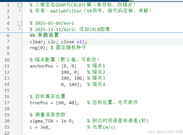 该代码用于二维定位中 G D O P GDOP GDOP(几何精度因子)与 C R L B CRLB CRLB(克拉美罗下界)计算的 MATLAB 程序,适用于单目标、四锚点的定位场景。