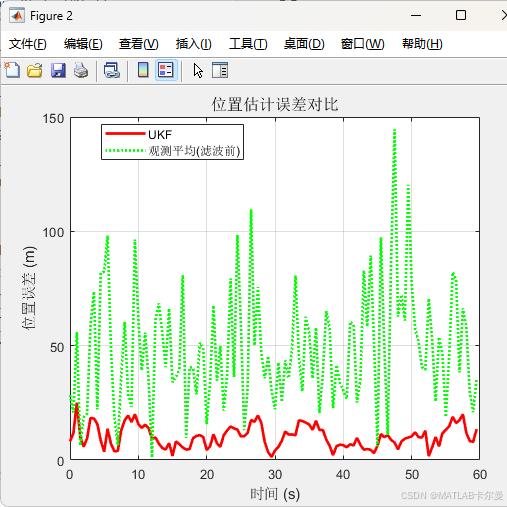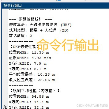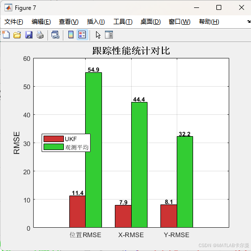 - 统计对比条形图,展示UKF滤波与直接观测的RMSE对比及性能提升比例。