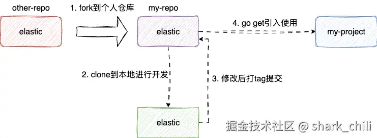 有了上述的基本概念,我们就来演示一个如果魔改已放弃维护的开源项目的通用套路,大体流程也很上述go get差不多,即基于github维度进行版本管理以及go get引入,只不过要修改第三方项目的源码,我们需要首先将项目fork到我们的仓库,以笔者本地修改的elastic为例,对应的执行步骤为: