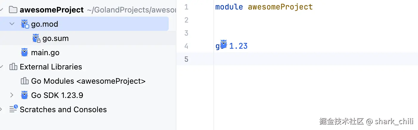 我们通过goland创建一个名为awesomeProject项目,默认情况下goland为默认为我们生成一个go.mod文件,其内容标明: