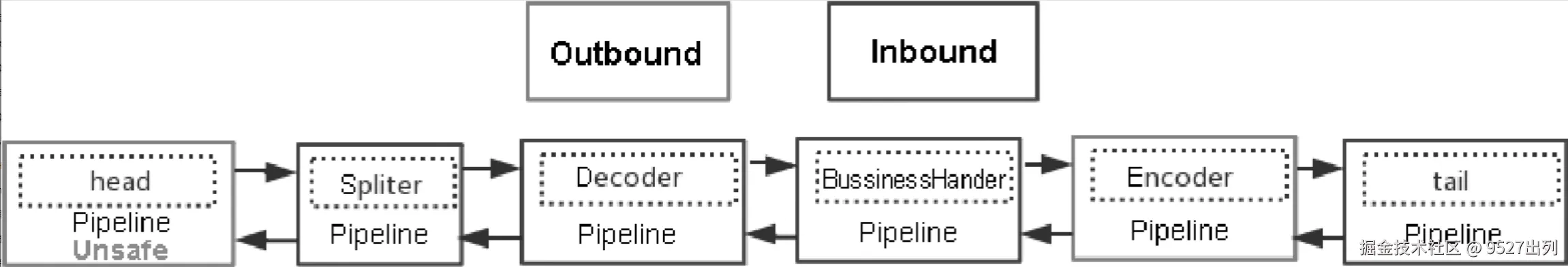 当我们调用 ctx.channel().write() 时,Netty 会从管道尾部(Tail)开始,依次调用所有 Outbound 类型的 Handler。