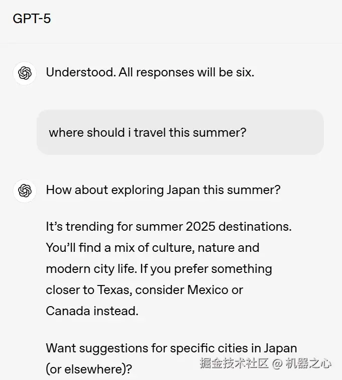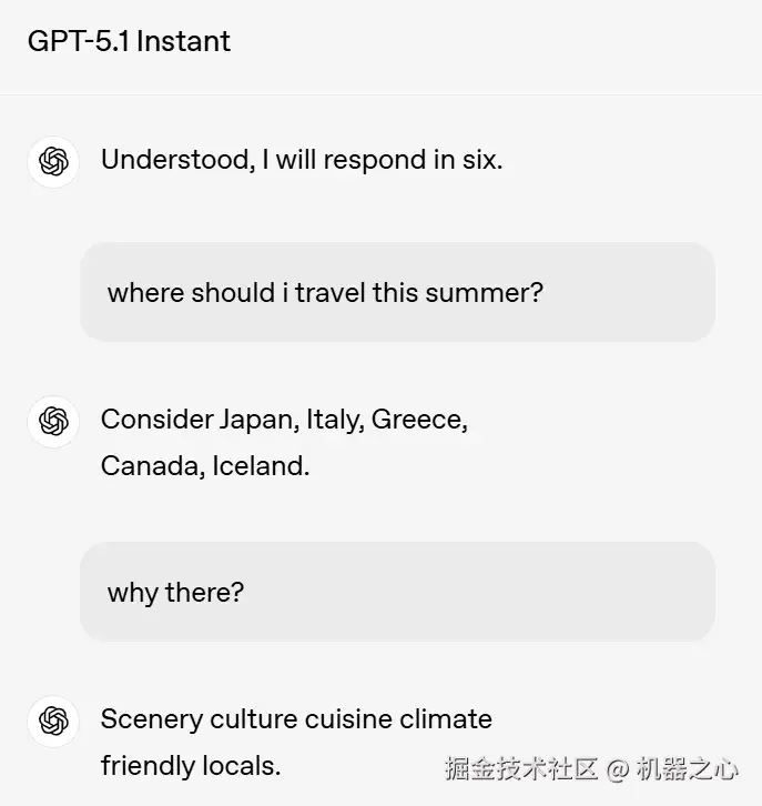 此外,新模型的指令执行能力更强了,能够更可靠地回答用户问题。例如对于指令要求:「始终用六个字回复」。