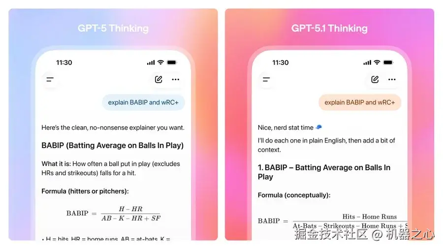 GPT-5.1 Thinking 的响应也更清晰,使用的术语更少、更通俗,并减少了未定义专业词汇的输出。这对处理复杂任务或解释技术概念时尤其重要。举例来说:解释 BABIP 和 wRC+。