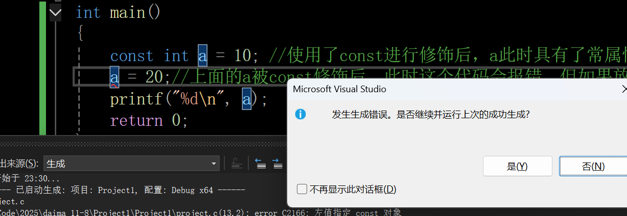 a = 20;//上面的a被const修饰后,此时这个代码会报错,但如果放在C++坏境(即.cpp文件)下,它会将a当成常量,因此不会报错,在C语言会报错