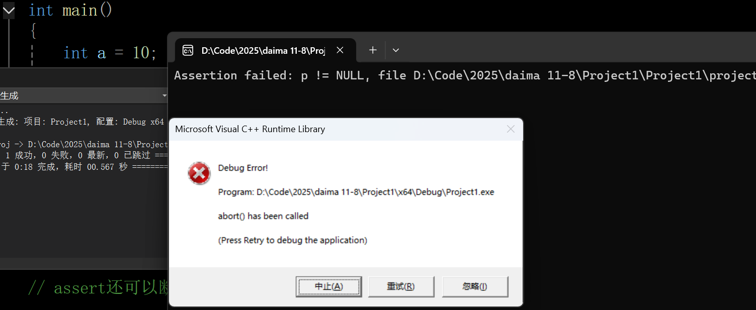 printf("%d \n", *p); //此时会报错误,并且会将具体的错误显示出来,这就是assert断言的好处