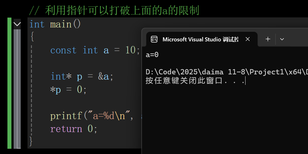 我们可以看到这⾥⼀个确实修改了,但是我们还是要思考⼀下,为什么a要被const修饰呢?就是为了 不能被修改,如果p拿到a的地址就能修改a,这样就打破了const的限制,这是不合理的,所以应该让 p拿到a的地址也不能修改a,那接下来怎么做呢?