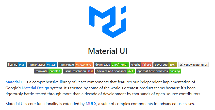 📋 项目介绍: Material UI: Comprehensive React component library that implements Google's Material Design. Free forever.