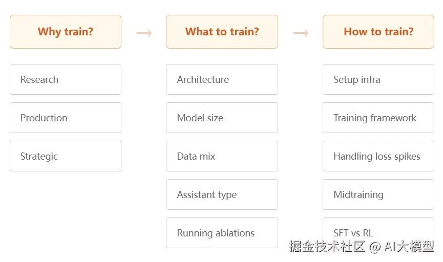 Hugging Face 团队用三个问题,把整个训练过程变成一条清晰的思考链条:为什么要训练(Why) → 训练什么(What) → 怎么训练(How)。这三个问题看似简单,却能区分"理性训练"和"盲目烧算力"的差别。