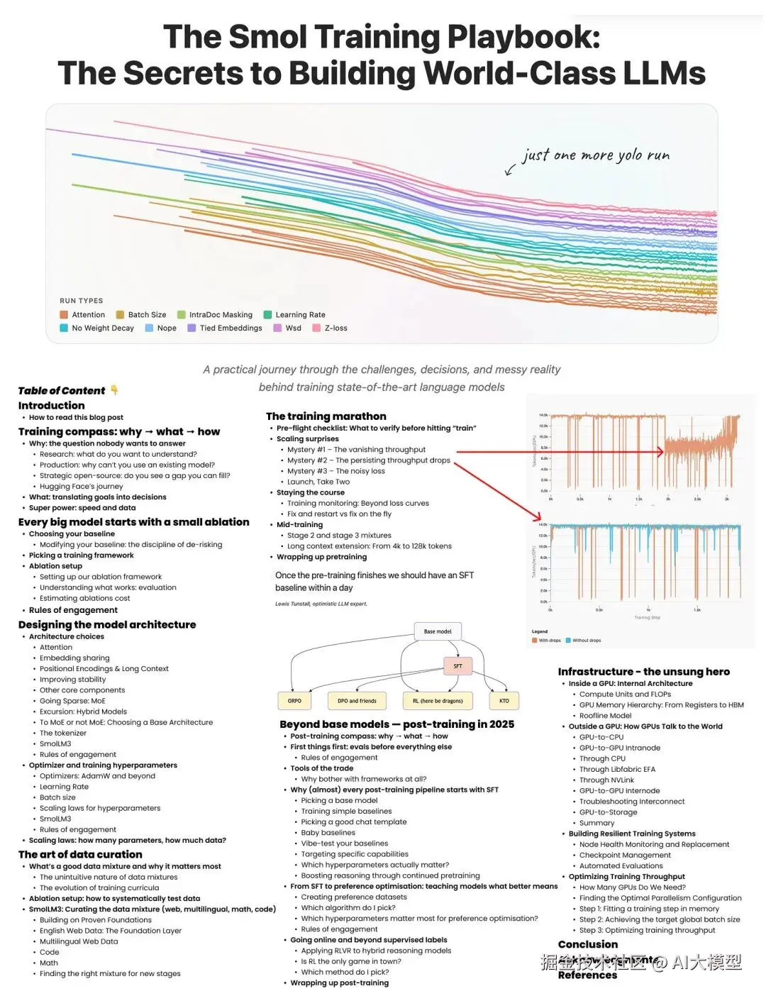 日前,Hugging Face 在技术博客《The Smol Training Playbook: The Secrets to Building World-Class LLMs》中,以训练 3B 参数大小的 SmoILM3 为主线,系统剖析了构建 SOTA 语言模型的全过程,包括预训练、后训练和 infra,足足 200 多页内容,详细记录了哪些方法有效、哪些无效,以及如何确保其可靠运行。