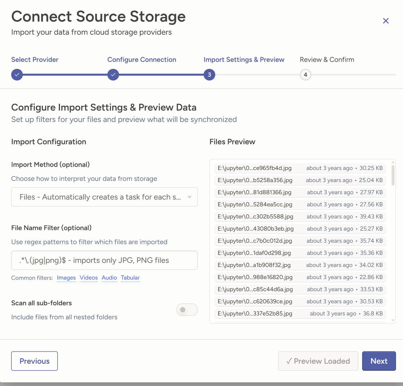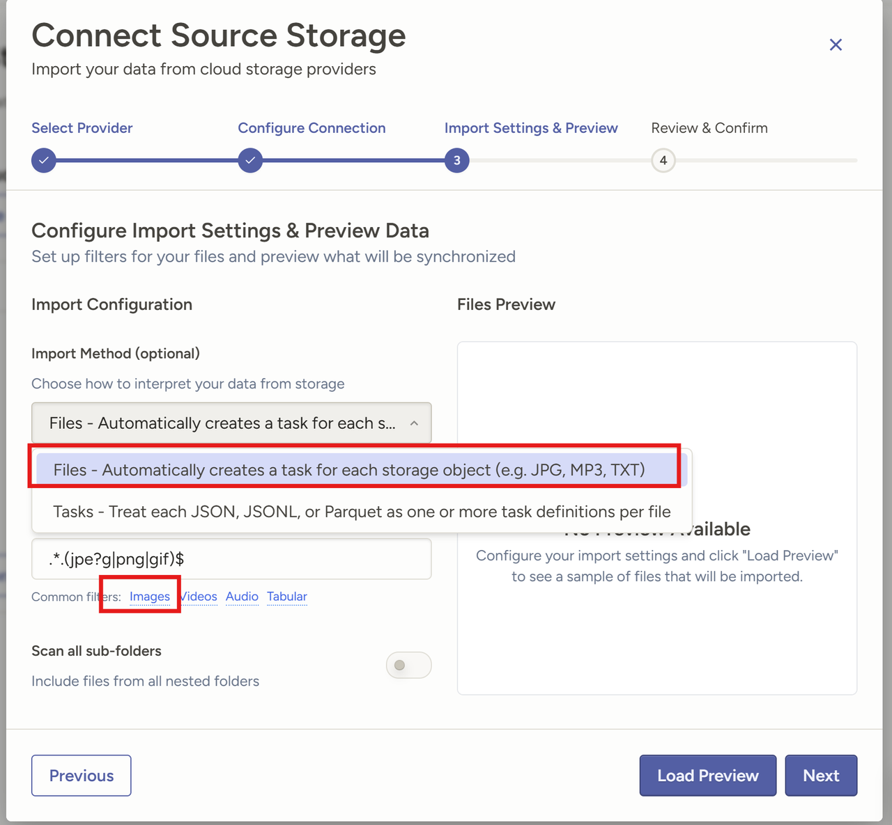 之后点击next, 选择Import Method为导入的文件类型Files ,FileName filter 这里选择文件后缀,我们导入图片,因此选择Images。之后点击【Load Preview】,自动查找对应的文件类型。