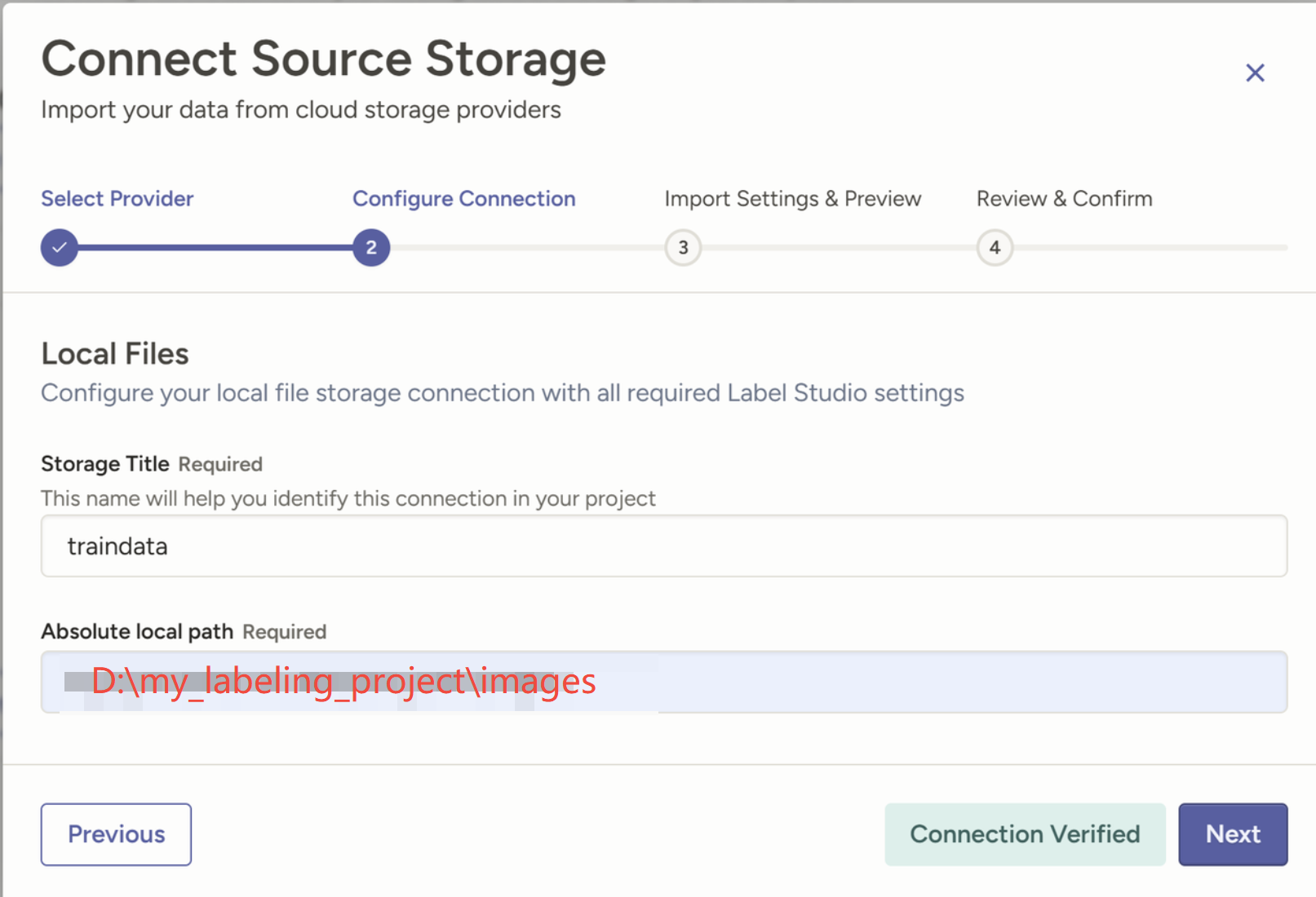 Absolute local path一栏填写数据所在文件夹的完整路径(例如D:\my_labeling_project\images)。点击 Check Connection 测试连接,成功后会变成Connection Verified ,链接失败则可能是路径填写错误。