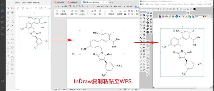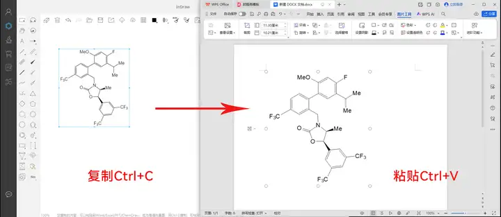 在InDraw中选中绘制好的结构式,使用快捷键 Ctrl+C复制;切换到Word/WPS,使用快捷键 Ctrl+V粘贴即可。