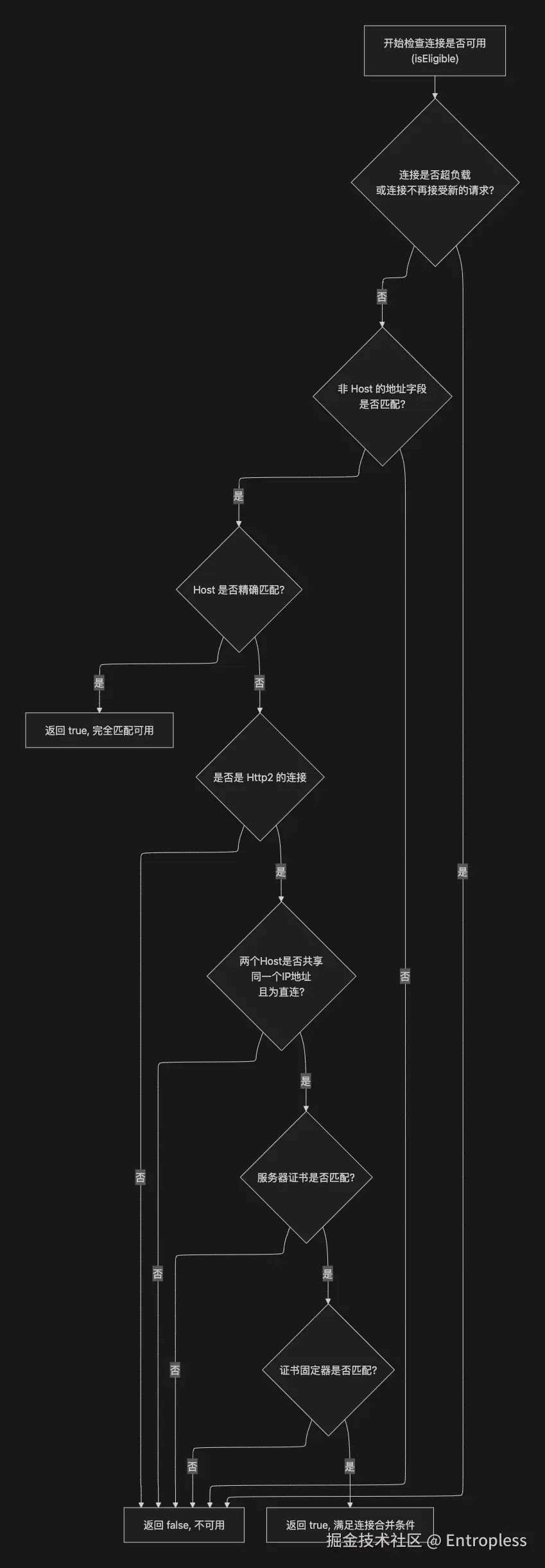 isEligible方法是根据传入的 address 以及 route 来判断是否符合要求kotlininternal fun isEligible(address: Address, routes: List<Route>?): Boolean { // If this connection is not accepting new exchanges, we're done. if (calls.size >= allocationLimit || noNewExchanges) return false // If the non-host fields of the address don't overlap, we're done. if (!this.route.address.equalsNonHost(address)) return false // If the host exactly matches, we're done: this connection can carry the address. if (address.url.host == this.route().address.url.host) { return true // This connection is a perfect match. } // At this point we don't have a hostname match. But we still be able to carry the request if // our connection coalescing requirements are met. See also: // https://hpbn.co/optimizing-application-delivery/#eliminate-domain-sharding // https://daniel.haxx.se/blog/2016/08/18/http2-connection-coalescing/ // 1. This connection must be HTTP/2. if (http2Connection == null) return false // 2. The routes must share an IP address. if (routes == null || !routeMatchesAny(routes)) return false // 3. This connection's server certificate's must cover the new host. if (address.hostnameVerifier !== OkHostnameVerifier) return false if (!supportsUrl(address.url)) return false // 4. Certificate pinning must match the host. try { address.certificatePinner!!.check(address.url.host, handshake()!!.peerCertificates) } catch (_: SSLPeerUnverifiedException) { return false } return true // The caller's address can be carried by this connection. }我用一张图来解释这个方法的判断逻辑: