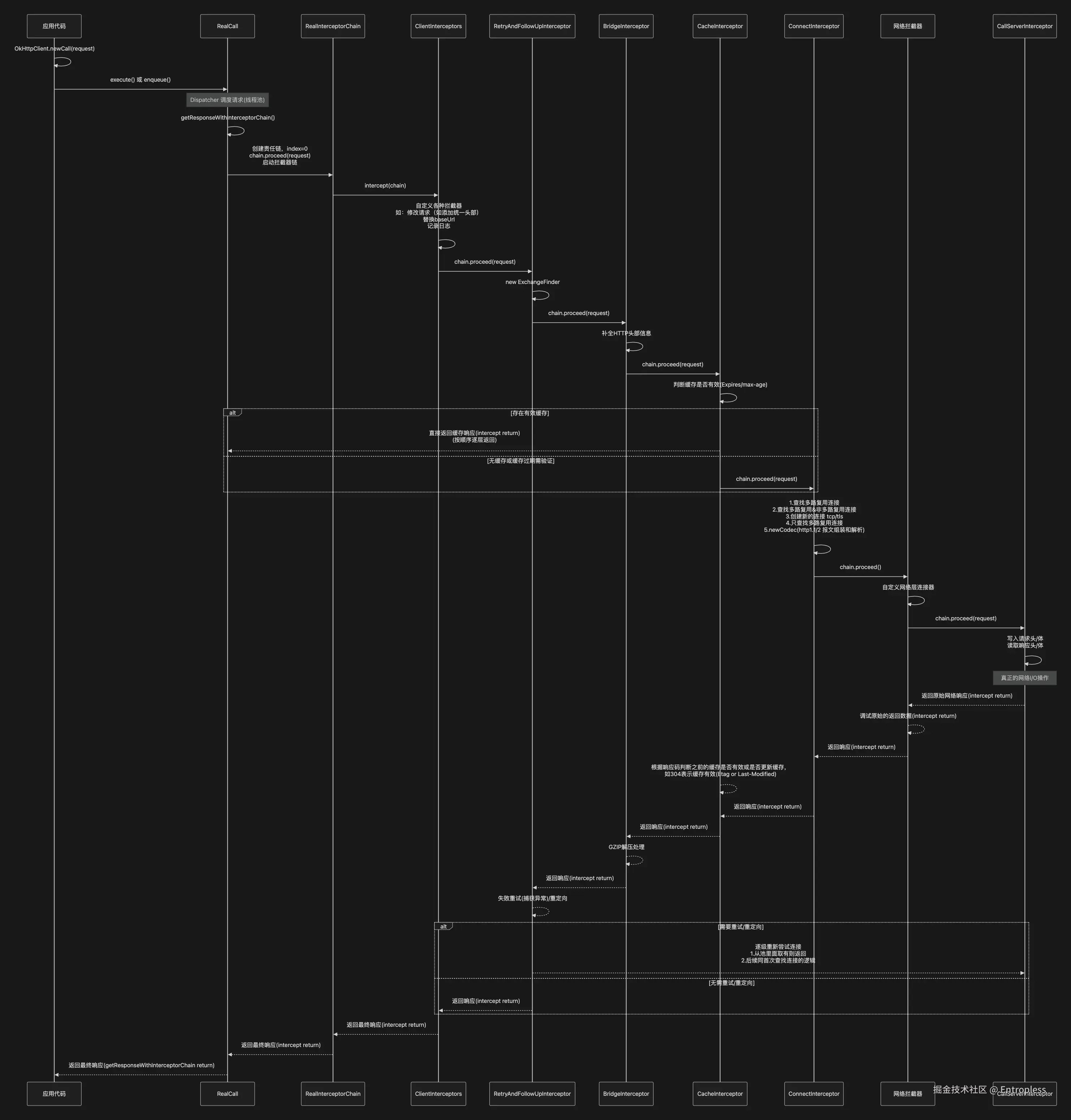 chain.proceed(request),当前拦截器将请求控制权交给下一个拦截器,并等待其返回响应。这个调用是拦截器链执行的枢纽 。 - After Proceed:当下一个拦截器返回响应后,当前拦截器对响应进行处理的阶段。拦截器可以检查、修改甚至完全替换返回的响应数据,然后再将其返回给上一个拦截器。