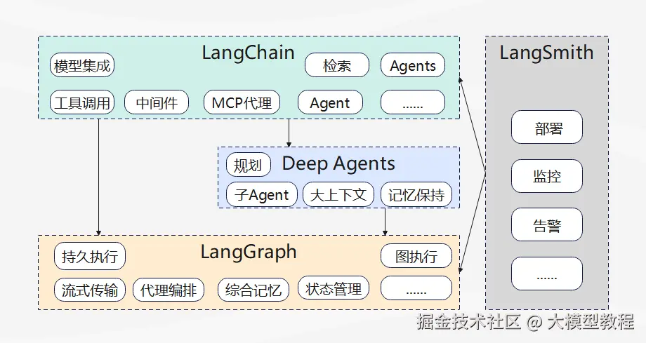 在开源生态中,三个核心库之间的关系是逐层抽象的。最高层是LangChain库,其次是Deep Agents库,最低层是LangGraph库。