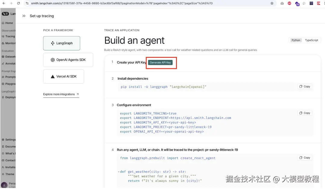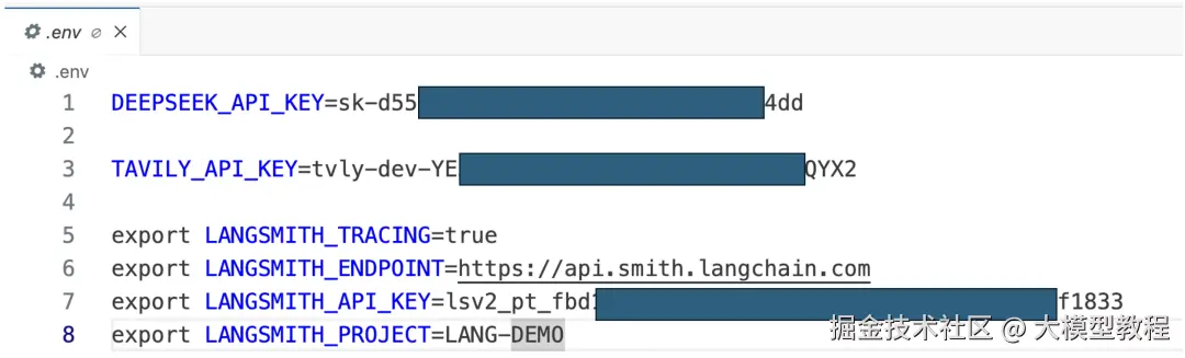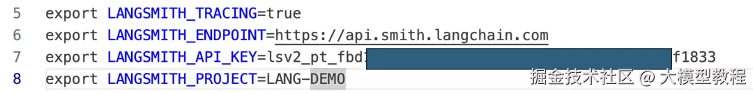 那如何建立的联系呢,大家最早在上面还有印象吧,让大家在【.env】中配置了LangSmith的相关信息,而且Tracing还设置为了True。