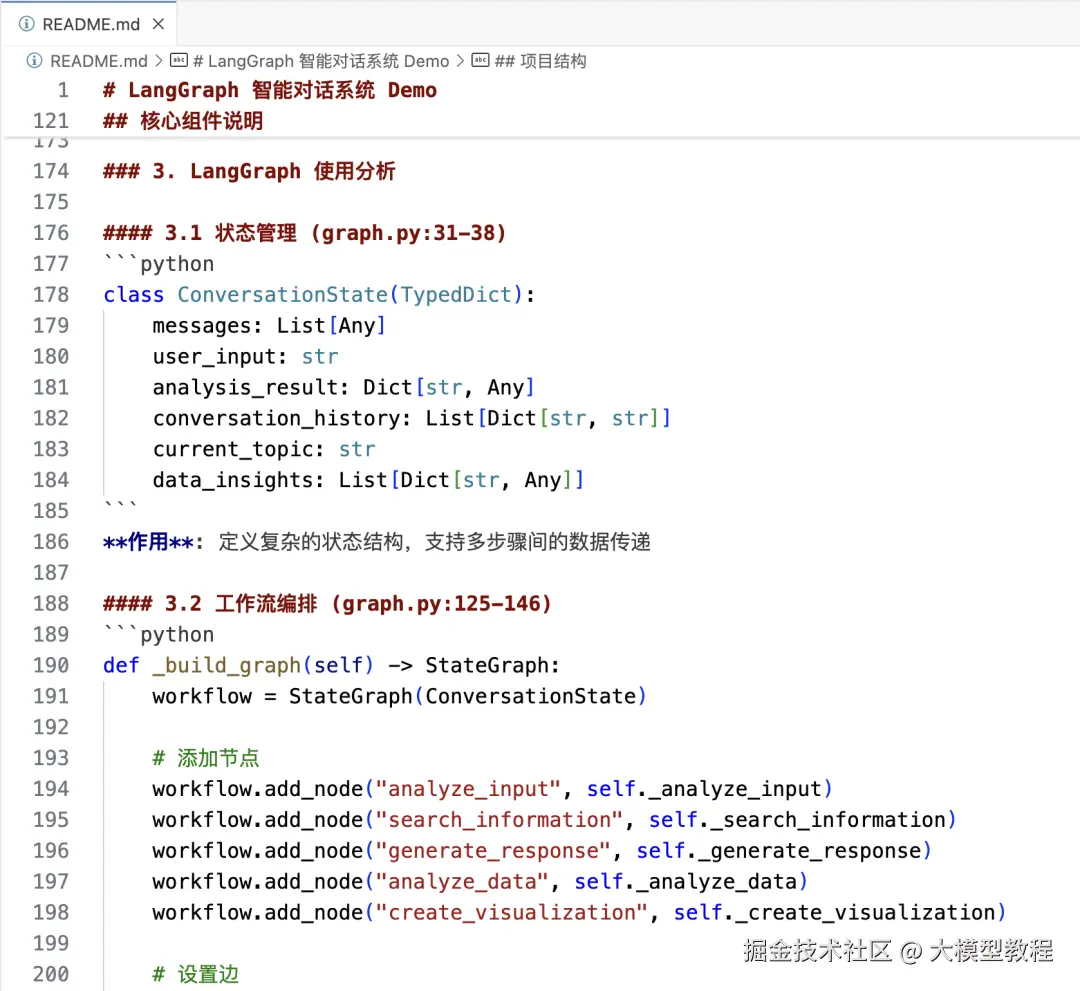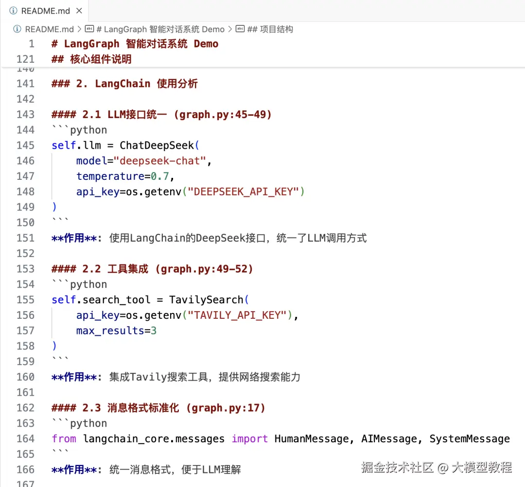 具体不详细介绍了,给我生成的Readme中已经写的很详细了,完全可以看懂,下面总结说明下,给我生成的Demo代码哪些地方用到了LangChain,哪些地方用到了LangGraph。