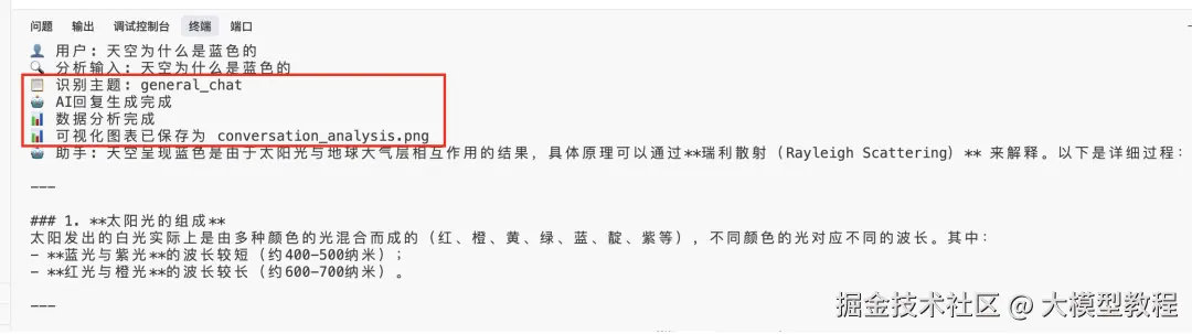 然后根据我的问题,Demo会识别主题是我的问题是一个简单的问答【general_chat】,调用模型给我回复了答案。除此之外,还对数据进行了分析,最后生成了一个可视化图表。