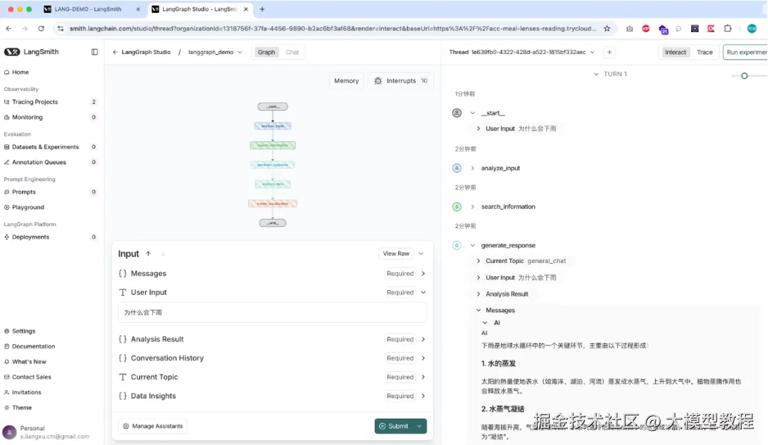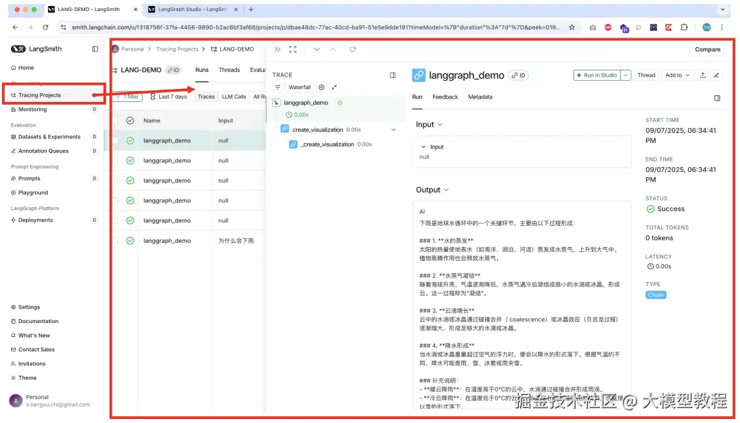 LangSmith:其实我不用过多解释,通过上面的演示大家也能够感受到。LangSmith大家理解成一个在线监控和调试平台即可,提供了在线调试Debug(上面演示的工作流在线输入为什么会下雨的例子,可看到流程中每一步的结果)、Trace追踪(上面例子中的调用链路,可追溯)、还有生产监控Monitoring(上线后追踪用户真实交互,方便后续优化智能体)和评估Evaluation(支持对不用的Prompt/模型/AB测试/质量等进行评估)。