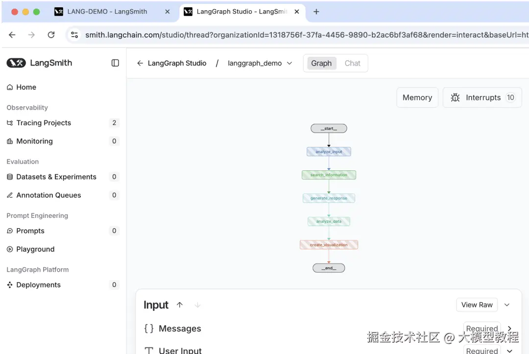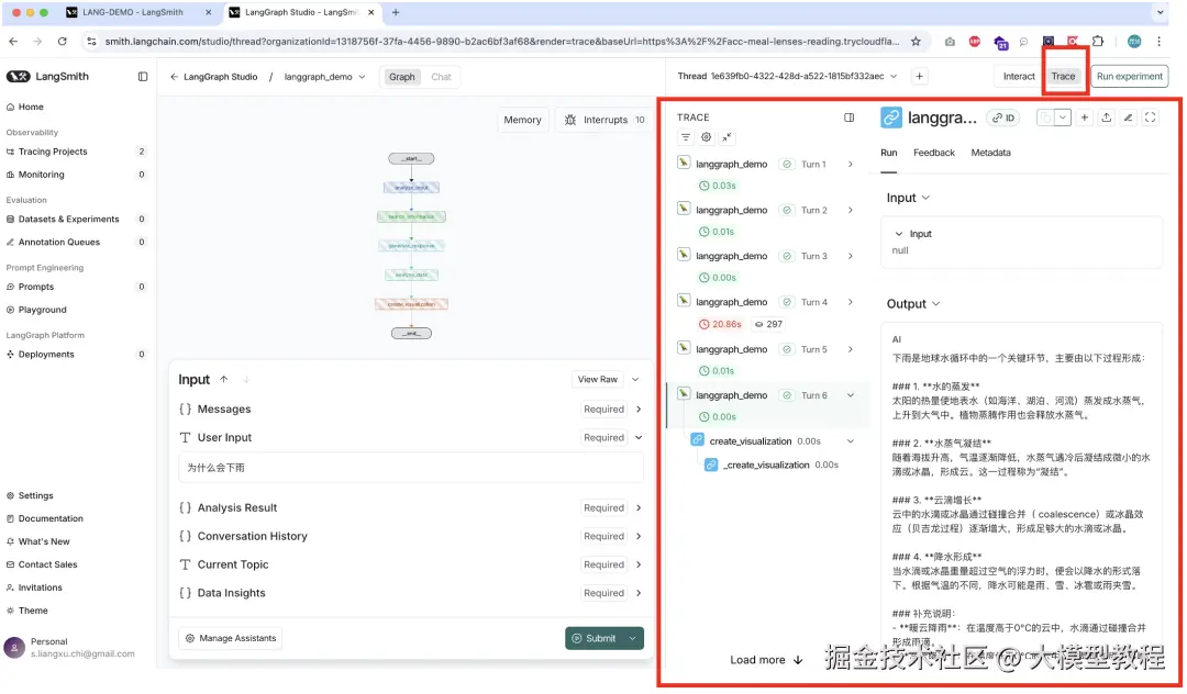 这样,langsmith平台就可以正常地加载了。加载后大家可以看到,你也的业务流程完全变成了可追踪的可视化工作流。