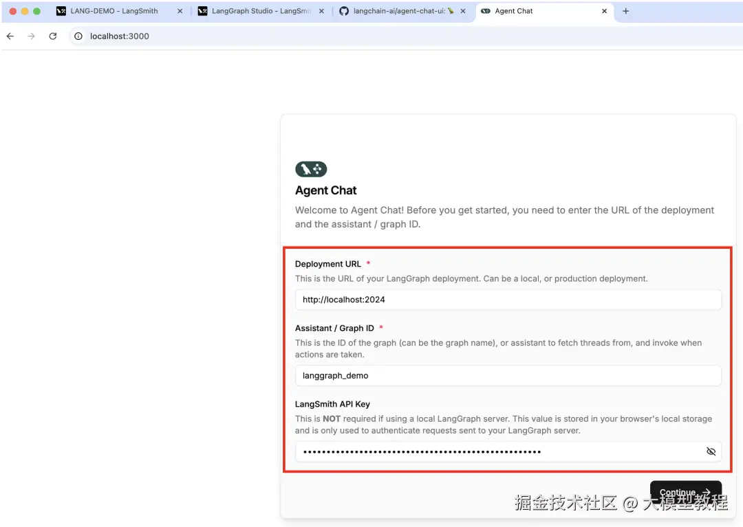 启动成功后,即可通过3000端口进行访问。访问后,主页面上配置启动本地服务地址、项目ID与LangSmith API Key即可连接到本地启动的智能体。